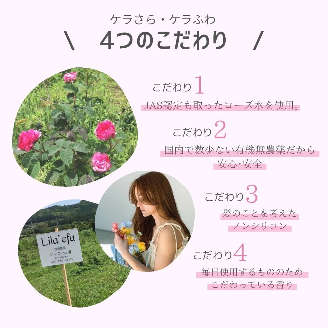 髪のパサつき毛髪リペア成分であるマレイン酸(ジカルボン酸)、さらに無農薬栽培のダマスクローズから抽出した天然ローズ水も十分に配合。ノンシリコンで髪の内側から毛髪繊維そのものをリペアし、ハイダメージでもハリとツヤが溢れるサラサラ質感に導きます。
